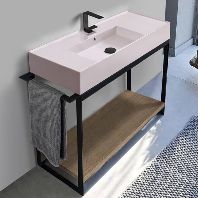 This ultra modern console vanity set was designed by Italian manufacturer Scarabeo. Inspired by modern and contemporary style bathroom design, this console set comes with a beautiful light pink ceramic sink that perfectly fits into a matte black sleek console base with a lower shelf in a natural brown oak finish. Ceramic sink features center aligned basin which allows for more counter space on the right and left side of the sink. Sink is available in a one hole or three hole configuration. Console features natural brown oak finished large bottom shelf for expansive storage underneath the console vanity. Matte black console base is made out of high quality metal and features an integrated side towel bar that can be utilized on the right or left side of the console. This console vanity is part of the Solid collection. Make a bold statement in your bathroom now with this modern console vanity. Ceramic sink (Scarabeo 5124-49) is US and Canada standards approved (IAPMO, UPC/cUPC, ASME A112.19.2-2018/CSA B45.1-18).