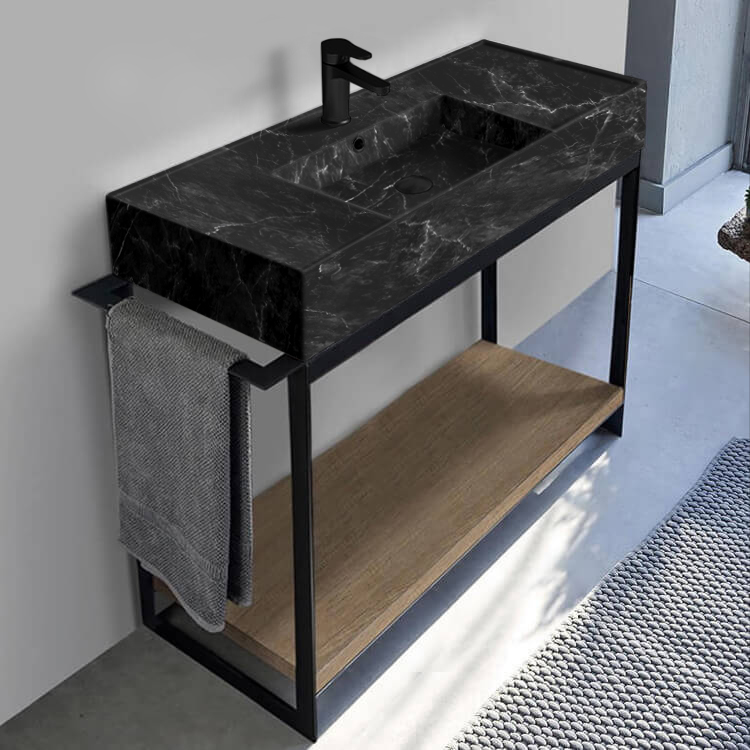 This ultra modern console vanity set was designed by Italian manufacturer Scarabeo. Inspired by modern and contemporary style bathroom design, this console set comes with a beautiful black marble design ceramic sink that perfectly fits into a matte black sleek console base with a lower shelf in a natural brown oak finish. Ceramic sink features center aligned basin which allows for more counter space on the right and left side of the sink. Sink is available in a one hole or three hole configuration. Console features natural brown oak finished large bottom shelf for expansive storage underneath the console vanity. Matte black console base is made out of high quality metal and features an integrated side towel bar that can be utilized on the right or left side of the console. This console vanity is part of the Solid collection. Make a bold statement in your bathroom now with this modern console vanity. Ceramic sink (Scarabeo 5124-49) is US and Canada standards approved (IAPMO, UPC/cUPC, ASME A112.19.2-2018/CSA B45.1-18).