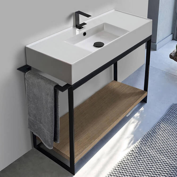 This ultra modern console vanity set was designed by Italian manufacturer Scarabeo. Inspired by modern and contemporary style bathroom design, this console set comes with a beautiful white ceramic sink that perfectly fits into a matte black sleek console base with a lower shelf in a natural brown oak finish. Ceramic sink features center aligned basin which allows for more counter space on the right and left side of the sink. Sink is available in a one hole, no hole, or three hole configuration. Console features natural brown oak finished large bottom shelf for expansive storage underneath the console vanity. Matte black console base is made out of high quality metal and features an integrated side towel bar that can be utilized on the right or left side of the console. This console vanity is part of the Solid collection. Make a bold statement in your bathroom now with this modern console vanity. Ceramic sink (Scarabeo 5124) is US and Canada standards approved (IAPMO, UPC/cUPC, ASME A112.19.2-2018/CSA B45.1-18).