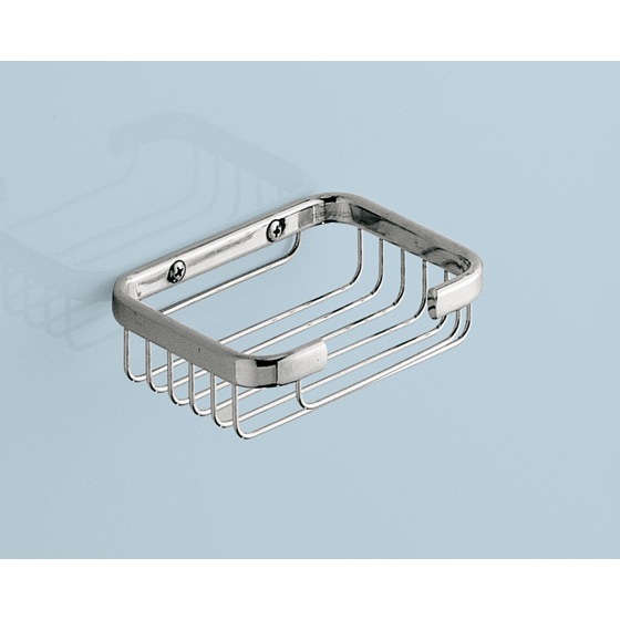 Contemporary style wall mounted wire soap holder. Wall soap dish made out of stainless steel with a polished chrome finish. Bathroom soap tray mounts to the bathroom wall with screws.