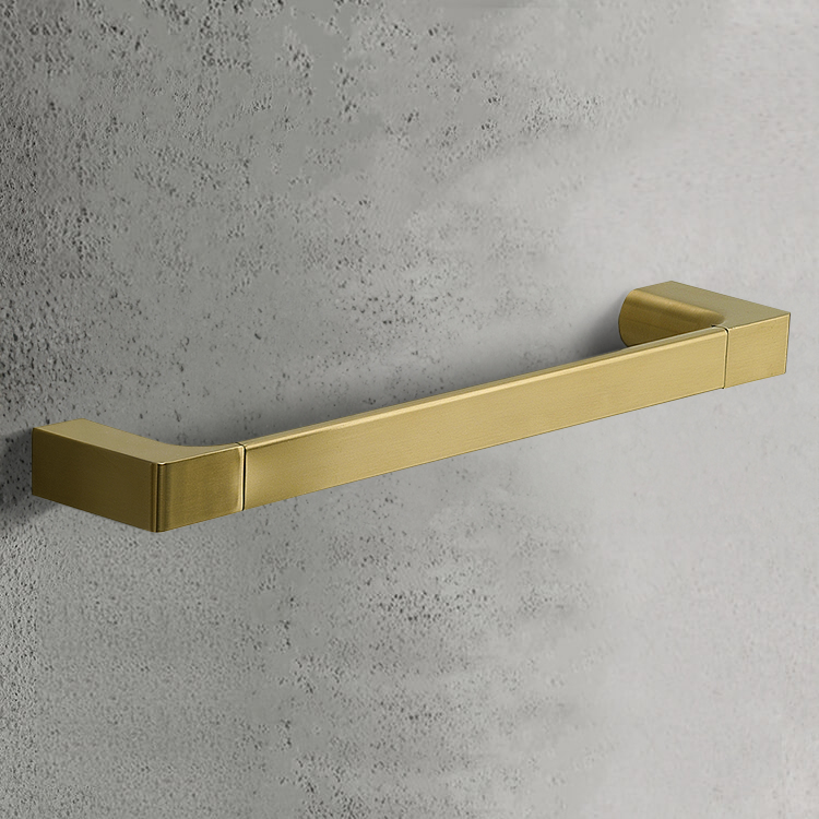 Contemporary style towel bar. This towel bar comes in a matte gold finish and is 14 inches wide. Designed by Gedy, it is part of their Perenei collection.