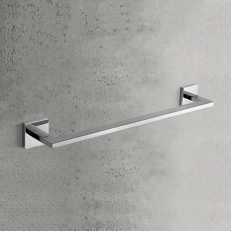 18 inch modern wall mounted towel bar. Stylish squared rectangular towel holder made out of high quality stainless steel and finished in polished chrome. Part of the Nameeks General Hotel collection.