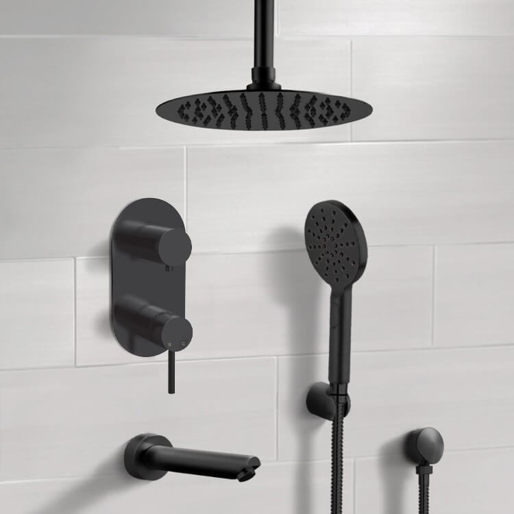 Black Tub and Shower Faucet Set with Handheld and Ceiling Shower Head