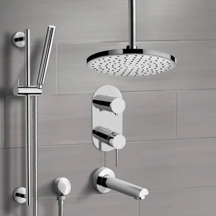 The Remer Galiano tub and shower faucet system is a perfect choice for your bathroom. Constructed out of brass, ABS and stainless steel and with a ceramic disc technology, this all-inclusive tub and shower faucet system includes a beautiful 8" ceiling mounted rain shower head, sleek handheld shower, sliding rail and a tub spout in a chrome finish.