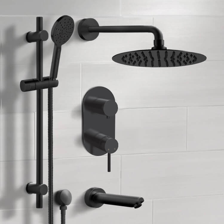 The Remer Galiano tub and shower faucet system is a perfect choice for your bathroom. Constructed out of brass, ABS and stainless steel and with a ceramic disc technology, this all-inclusive tub and shower faucet system includes a beautiful 10" rain shower head and 16 inch shower arm, 4-function handheld shower, sliding rail and a tub spout in a matte black finish.